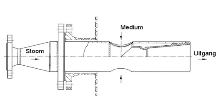Une quantité d'eau de 6000 litre/heure est chauffée de 20°C à 90°C par 3 injecteurs de vapeur de type RKE 40/25 connectés avec une capacité de vapeur de 3x280 kg/h = 840 kg/h. Lors de l’utilisation de plusieurs injecteurs, un Δt ou réchauffement de l'eau important